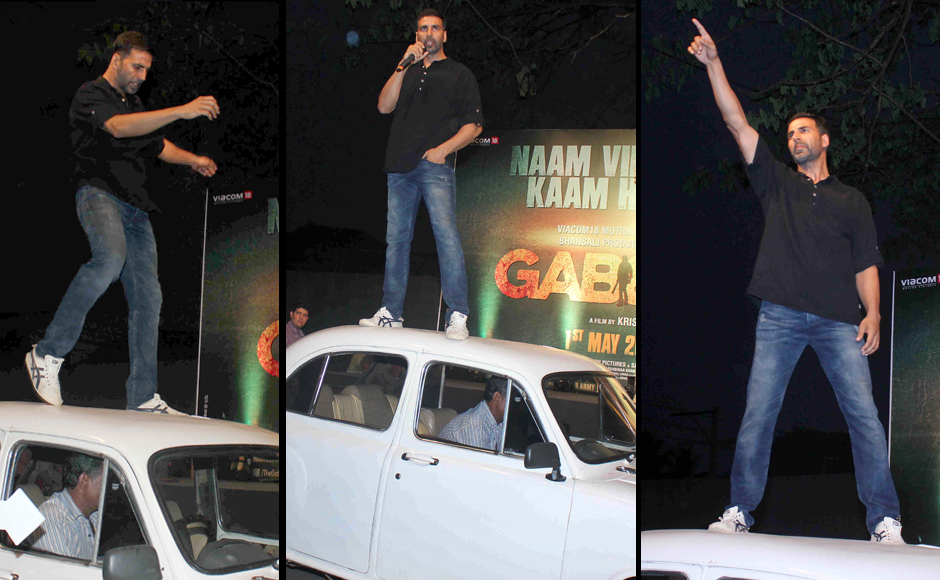 Akshay Kumar was spotted doing some daring stunts at the trailer launch of Gabbar Is Back. Solaris Images