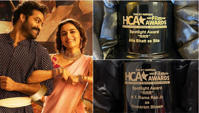 Ahead of the mega Oscars event, SS Rajamouli’s RRR seems in no mood to slow down yet as it continues to roar on the international stage. Registering yet another big win on a global platform, RRR actors Alia Bhatt and Jr NTR have been awarded the ‘Spotlight Award’ at Hollywood Critics Association 2023. This came right after the film already won four awards at the event held last week. While both Alia and NTR couldn’t travel to the US to receive the awards, the association in a tweet notified that their awards will be sent out by next week. Meanwhile, the magnum opus’s director SS Rajamouli and actor Ram Charan did attend the event. While sharing pictures of the trophies, HCA wrote, “Dear RRR supporters & fans, We would like to share with you the awards for N.T Rama Rao Jr. & Alia Bhatt. We will be sending them out next week. Thank you for all your love and support. The Hollywood Critics Association.” Check: https://twitter.com/HCAcritics/status/1631451619601809409 As soon as HCA announced the awards for both actors and also the film, fans went all crazy taking to social media handles to congratulate the entire team. See reactions: https://twitter.com/happyvibes_azu/status/1631717911281782784 https://twitter.com/happyvibes_azu/status/1631715690225848321 https://twitter.com/TanyaSachdeva03/status/1629493726941970432 https://twitter.com/HOUSESWAPAN/status/1629324476709220353 https://twitter.com/NTRARMYOFFICIAL/status/1629336384338300928 https://twitter.com/SIGINAM_VENU/status/1630636155325788160 Speaking about the other awards received by the Telugu blockbuster, it won Best Action Film, Best International Feature, Best Original Song, and Best Stunts. Both SS Rajamouli and Ram Charan were present in Los Angeles to pick up the trophies. The proud director after receiving the award thanked the entire team and their fans. On the other hand, Ram Charan who also presented a few awards at the event also expressed his gratitude and thanked everyone for all the love and response to RRR. RRR at Oscars 2023 Apart from winning several international awards, SS Rajamouli’s RRR has also bagged an Oscar nomination in the Best Original Song category for its hit song ‘Naatu Naatu’. The song has already won the Golden Globe Award followed by the Critics Choice Award. The 95th Academy Awards aka Oscars 2023 is all set to take place on Sunday, 12 March 2023 at 8 PM ET in Los Angeles. It will be available to live stream in India on Monday, 13 March 2023 around 6:30 AM - 7:00 AM. Read all the Latest News , Trending News , Cricket News , Bollywood News , India News and Entertainment News here. Follow us on Facebook , Twitter and Instagram .