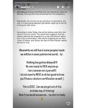 said on Tuesday, slamming various media reports claiming that she will be taking rest after completing her work commitments to focus on her pregnancy. In a note shared on her Instagram Stories, Alia criticised articles claiming that her husband, actor Ranbir Kapoor, will be travelling to the UK, where she is filming her Hollywood debut Heart of Stone, to bring her back home. “Nothing has gotten delayed! No one needs to PICK anyone up. I’m a woman, not a parcel. I do not need to REST at all but good to know you’ll have a doctor’s certification as well,” the actor wrote. Alia also posted a screenshot of a news portal’s Instagram page which reported that she had planned her pregnancy in a way that it doesn’t affect her work. “This is 2022. Can we pls get out of this archake (archaic) way of thinking! Now if you would excuse me… My shot is ready,” the 29-year-old actor added.