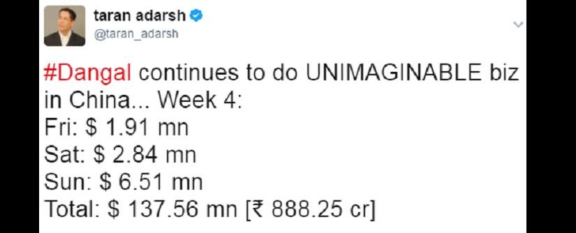 On 31 May, trade analyst Ramesh Bala tweeted that the Dangal box office collection in China had touched Rs 979.50 crore.