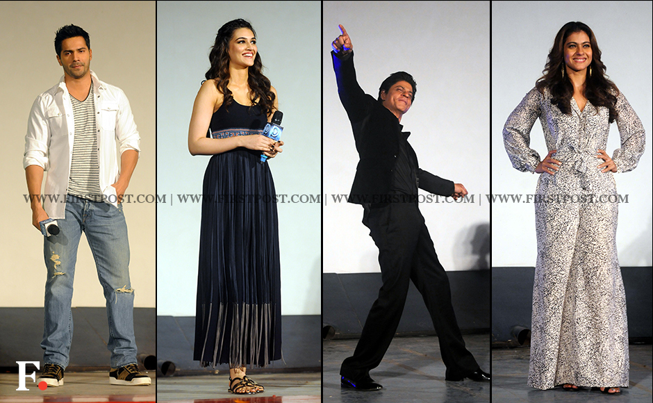 Dilwale stars Varun Shawan, Kriti Sanon, Shah Rukh Khan and Kajol at the launch of the song Gerua in Maratha Mandir. Image Credit: Sachin Gokhale/Firstpost