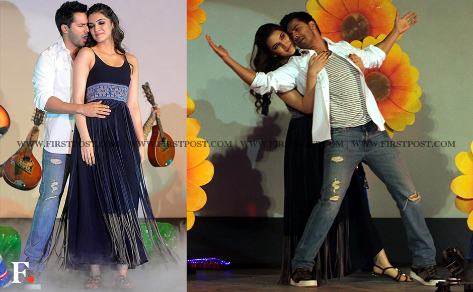 Varun Dhawan and Kriti Sanon look to recreate the iconic pair of Shah Rukh Khan at the launch of the song. Image Credit: Sachin Gokhale/Firstpost