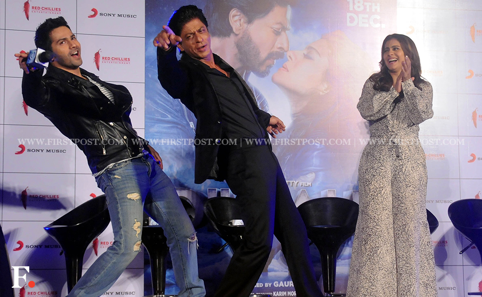 Varun Dhawan and Shah Rukh Khan strike a pose as Kajol looks on at the launch of the song Gerua. Image Credit: Sachin Gokhale/Firstpost