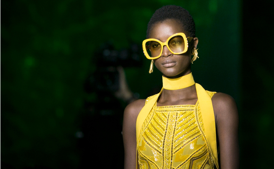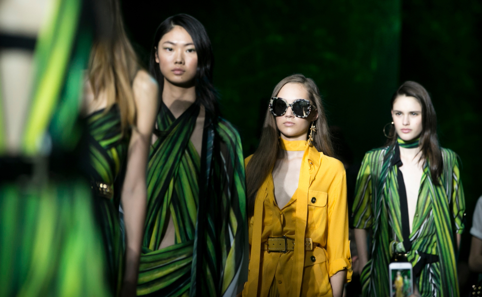 Saab’s collectetion also saw the repeated use of green, blue, yellow and red in the creations. Image from AP.