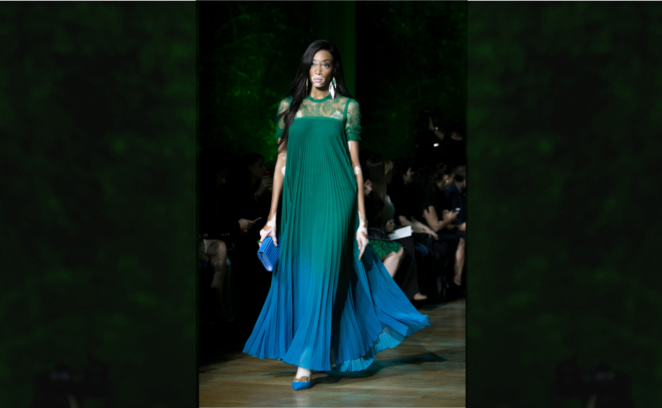 The designer also relied heavily on flowing drapes for this collection. Model Winnie Harlow walks the ramp for Elie Saab. Image from AP.