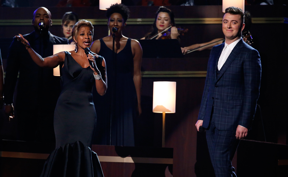 Sam Smith performs ‘Stay With Me’ with Mary J Blige at the 57th annual Grammy Awards in Los Angeles. Reuters