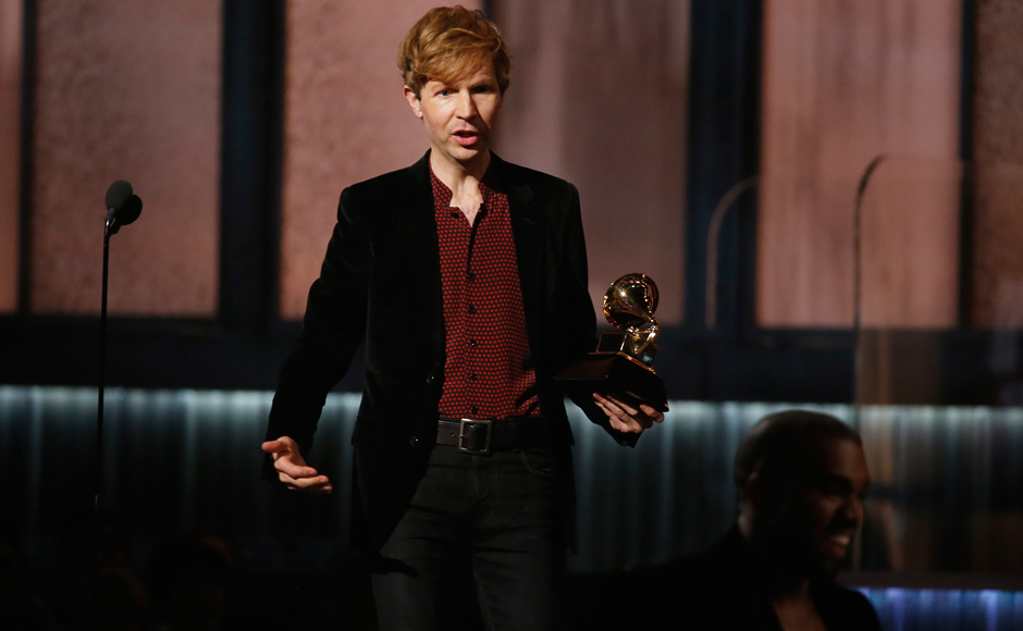 Beck calls out to Kanye West, who pretended to take the stage after Beck won album of the year for “Morning Phase,” at the 57th annual Grammy Awards. Reuters