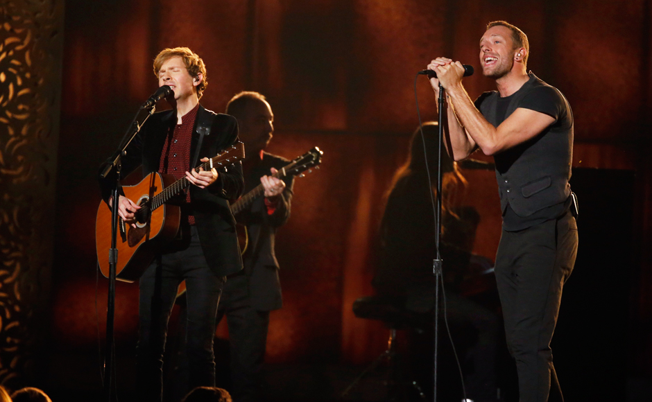 Beck (L) and Chris Martin perform ‘Heart is a Drum’ during the 57th annual Grammy Awards in Los Angeles. Reuters