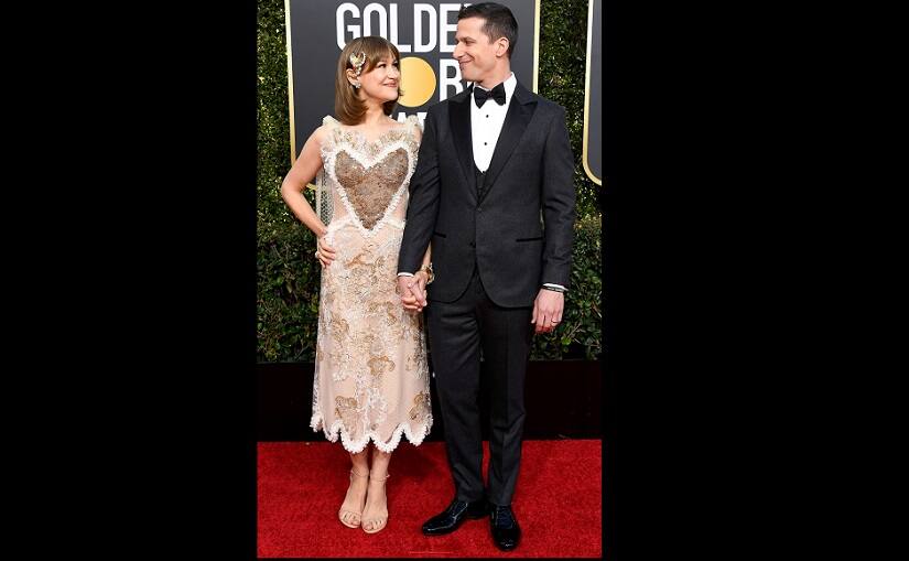 Golden Globes co-host Andy Samberg was the first to hit the red carpet. He arrived with his wife musician Joanna Newsom, who was literally wearing her heart on her bodice.
