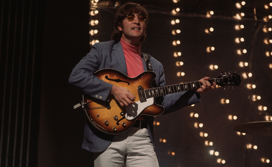 1966: John Lennon performing against a lit backdrop. (Photo by Keystone/Getty Images)