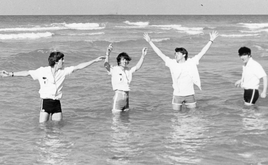 21st June 1964: The Beatles, (From left to right) George Harrison (1943 - 2001), Ringo Starr, Paul McCartney and John Lennon (1940 - 1980), enjoying the Florida sea and sunshine at Miami Beach after their record-breaking US tour. (Photo by Keystone/Getty Images)