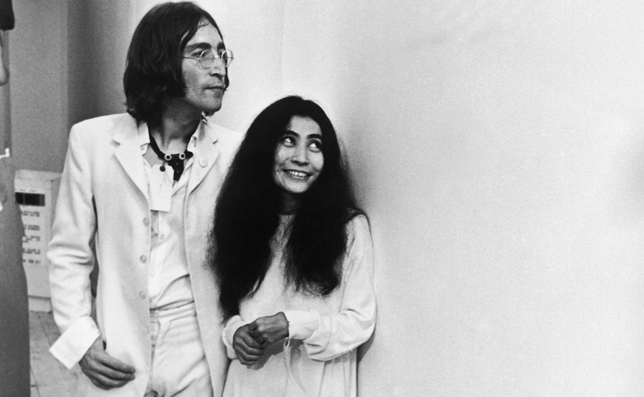 1st July 1968: John Lennon and his wife, artist Yoko Ono, at the opening of John’s ‘Joke Art’ exhibition. (Photo by Ballard/Express/Getty Images)