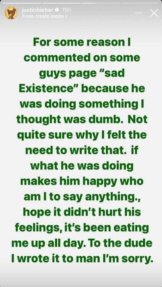 Justin Bieber mentioned that he had earlier posted a rude comment on someone’s Instagram post and had come to