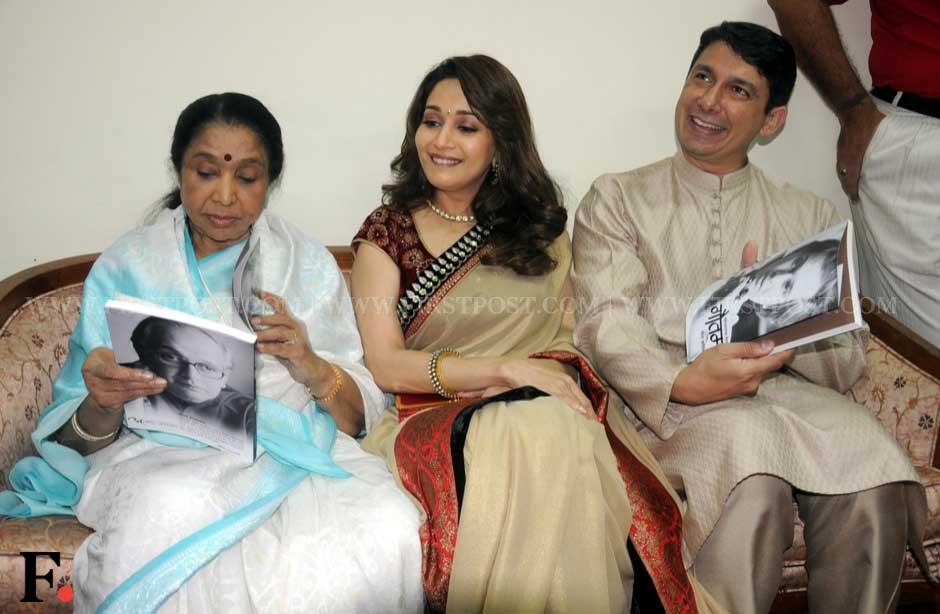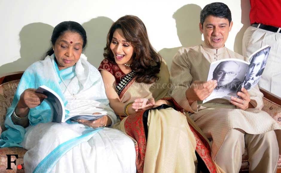 Asha Bhonsle, Madhuri Dixit and Sriram Nene check out the new book. SachinGokhale/Firstpost.