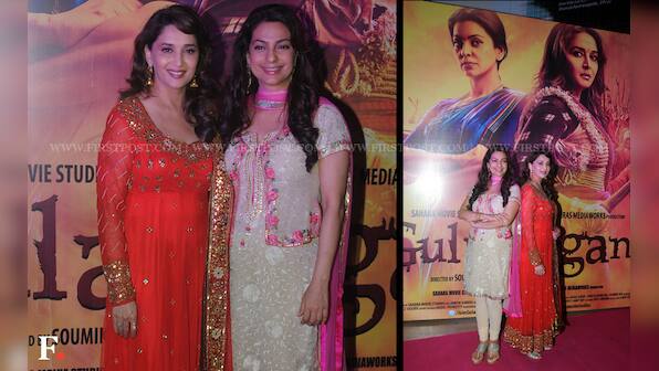 Madhuri Dixit and Juhi Chawla looked gorgeous in traditional attires at the Gulaab Gang screening. Here are the images.