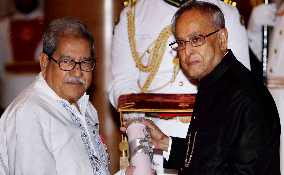 President Pranab Mukherjee presents Padma Bhushan award to Prof Anisuzzaman, Professor Emeritus at the University of Dhaka, during Padma Awards 2014 at the Rashtrapati Bhavan in New Delhi on Monday. PTI