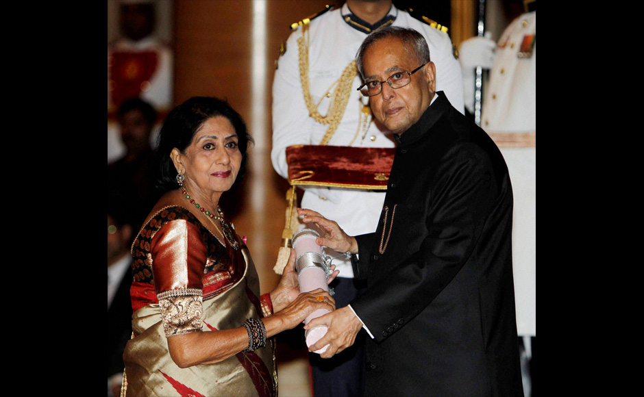 President Pranab Mukherjee presents Padma Shri to Bengali actress Sabitri Chatterjee during Padma Awards 2014 at Rashtrapati Bhavan in New Delhi on Monday. PTI