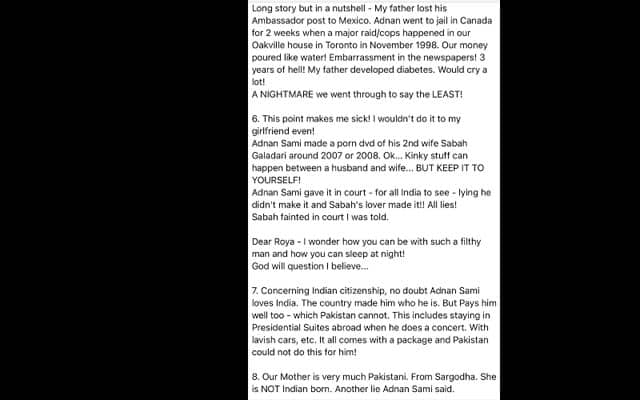 Adnan Sami ’s brother Junaid Sami Khan who has made some explosive allegations against his singer brother and alleged that he lied about being born in England, never helped him in his career, and remained selfish throughout. Junaid said Sami was born in a Rawal-Pindi hospital and not in England as stated by the singer. He also stated that Adnan knew Junaid was a better singer but he never helped him and remained selfish throughout. [caption id=“attachment_12415292” align=“alignnone” width=“640”] Adnan Sami’s brother Junaid Sami Khan’s social media post[/caption] Junaid also revealed how his family went through a tough time and how their father developed diabetes and used to cry a lot. [caption id=“attachment_12415302” align=“alignnone” width=“640”]