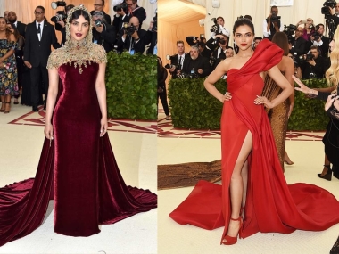 With halos and Pope-inspired dresses, the Met Gala 2018 red carpet saw Indian actresses Priyanka Chopra and Deepika Padukone making a statement in their very own ensembles in sync with the “Heavenly Bodies: Fashion and the Catholic Imagination” theme. Priyanka, who made her debut internationally with the American drama series Quantico, opted for a wine red strapless Ralph Lauren gown with a billowing train paired with an embellished gold chain headdress reminiscent of a medieval knight. She completed her look with subtle make-up and maroon lips.