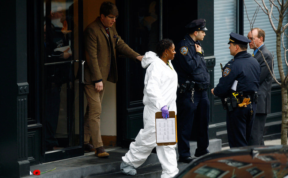 Police officers stand outside the apartment of Philip Seymour Hoffman after he was found dead in New York. Reuters