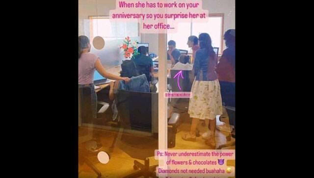 on Monday, 14 November completed 4 years of their happy married life. The star couple got hitched in traditional Konkani and Sindhi-style ceremonies held in Lake Como, Italy back in 2018 and have been going strong since then, giving out major couple goals. Just like any year, this time was also special for the two of them. However, while Deepika was busy with her professional commitments and couldn’t celebrate the day, husband Ranveer Singh did the sweetest thing ever and decided to drop in at her office with flowers and chocolates. Taking to his Instagram story, Ranveer Singh shared a picture from Deepika’s office where he can be seen standing outside her cabin, seemingly gearing up to surprise her from behind. On the other hand, the actress who seemed quite aware of Ranveer’s arrival is seen engrossed in work. Take a look: [caption id=“attachment_11630371” align=“alignnone” width=“640”]