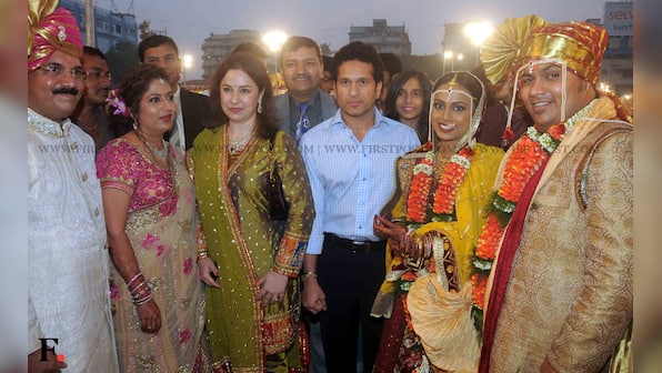 Pradip and Dr Nandita Palshetkar, Anjali and Sachin Tendulkar and the newly wed couple Rohan Pulsetkar and Karishma. Sachin Gokhale/Firstpost