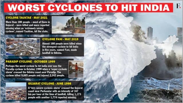 Graphic: Pranay Bhardwaj[/caption] The cyclone on Thursday evoked strong memories in the minds of the people in Gujarat who saw horrific destruction owing to a cyclone 25 years ago. In June of 1998, a ‘very severe cyclonic storm’ had crossed the Gujarat coast near Porbandar with an intensity of 167 km per hour, killing 1,173 people and another 1,774 people reported missing. Some say that these numbers didn’t reflect the reality of the moment and over 4,000 people had died in that cyclone. Blame global warming According to many experts, Cyclone Biparjoy was more intense owing to ‘global warming’ factor. As per IMD, Biparjoy intensified twice in its lifetime because of the unusually warm waters of the Arabian Sea due to global warming. A study by Pune’s Indian Institute of Tropical Meteorology (IITM) has recorded that the number of cyclones has increased by 52 per cent and incidents of very severe cyclones went up by 150 per cent. The rise in sea-water temperatures increases humidity due to evaporation, which lends energy to cyclones to intensify. [caption id=“attachment_12745702” align=“alignnone” width=“640”]