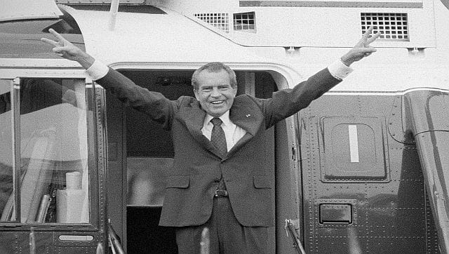 Richard Nixon says goodbye with a victorious salute to his staff members outside the White House as he boards a helicopter after resigning the presidency on 9 August, 1974. File image/AP[/caption]