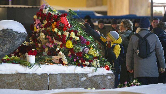People lay flowers paying their last respects to Alexei Navalny at the monument, a large boulder from the Solovetsky islands, where the first camp of the Gulag political prison system was established. AP[/caption] The news of his death