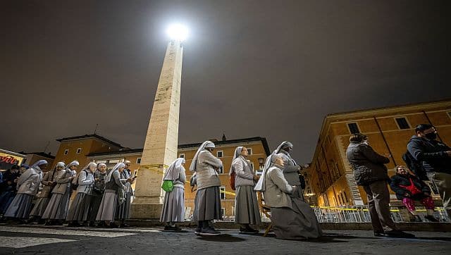 Nuns queue before dawn to view the body of Pope Emeritus Benedict XVI as it lies in state at St. Peter’s Basilica at the Vatican. AP[/caption]