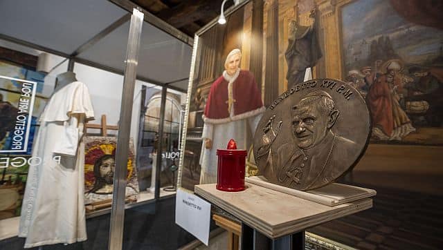 A metal disc shows Pope Emeritus Benedict XVI alongside a painting of him and one of the last cassocks worn by him before his resignation in 2013, according to the director of the Progetto Arte Poli gallery where it is displayed, near the Vatican. AP[/caption]