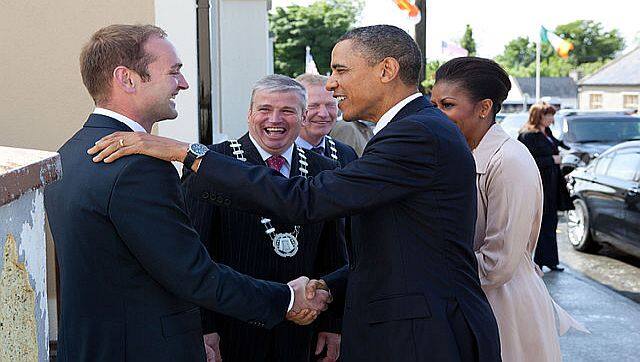 Henry Healy (left) greets his eighth cousin, US president Barack Obama, and First Lady Michelle Obama, after their arrival in Moneygall, Ireland. File image/Wikimedia Commons[/caption] He attempted to rally the Irish, at a time of a deep economic crisis, declaring “Is feidir linn!”, the Gaelic version of his 2008 campaign slogan “Yes, we can”. He also made a quick dash to Moneygall in County Offaly, to down a pint of Guinness (Michelle had a half-pint) in the tiny town where his great-great-great grandfather on his mother’s side grew up. Trump troubles There was no pressing of the flesh when Donald Trump stopped over in June 2019 for a meeting with Ireland’s then prime minister, Leo Varadkar.