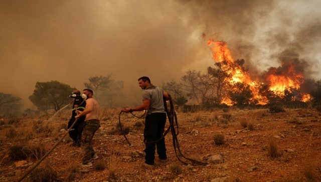 Greek fire service spokesman Vassilis Varthakogiannis told Skai TV: “This is not a fire that will be over tomorrow or the day after tomorrow. It’ll be troubling us for days.” More than 260 firefighters were still battling flames for an eighth consecutive day on Rhodes, supported by two helicopters and two planes. British citizen Cathy Holloway told BBC she has been evacuated three separate times. Speaking to BBC, Holloway, who has a flat in Rhodes said, “I had to get out in a hurry yesterday afternoon and as I drove up the hill away from my apartment, I could see the flames in the distance. “The family I’m staying with [have] taken me into their home, they’ve made me one of their family. How did the fires start? The cause of the fires is yet to be determined. Inews quoted fire service spokesperson Yiannis Artopios as saying that some suspected arsonists are being questioned. [caption id=“attachment_12890252” align=“alignnone” width=“640”] Men help a firefighter as they try to extinguish a wildfire burning near the village Vlyhada, near Athens, Greece. Reuters[/caption] “Fires are not sparked on their own,” Artopios said. “They are triggered by the human hand, be it intentionally or not. We currently have several people being questioned in connection with their probable involvement.” But as temperature records tumble, experts have pointed to climate change driven by the burning of fossil fuels, arguing that global warming is playing a key role in the devastating heat.