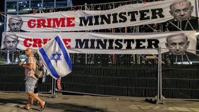A demonstrator walks with an Israeli flag past banners condemning Israeli PM Benjamin Netanyahu during a rally against the Israeli government’s judicial overhaul plan near Azrieli Mall in Tel Aviv in September. File image/AFP[/caption] His own legal controversies stemming from