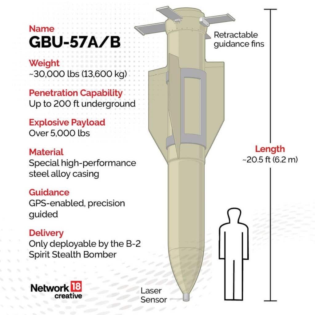 The bunker buster is a broad term used to describe bombs, which have the ability penetrate deep below the surface before exploding. To target Iran’s Fordow nuclear plant, the US used the latest GBU-57 A/B Massive Ordnance Penetrator bomb. This is a roughly 13,600 kg precision-guided bomb designed to attack deeply buried and hardened bunkers and tunnels, according to the US Air Force.