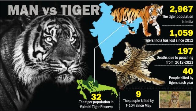 The killing of the “man-eater” brings to light the man-animal conflict, which remains one of the biggest challenges to wildlife conservation in a populated country like India. Often a tiger who ventures into human habitation is labelled a “man-eater” like in the case of Avni and T-104, a term that legally allows the animal’s capture. The poor living near forests often questions why the life of tigers is more important than theirs. “India’s most vulnerable Adivasis, Dalits and other indigenous peoples are dependent on forest resources and those who live close to tiger reserves are further marginalised. It is not easy to discuss conservation issues without addressing people’s basic living conditions under extreme poverty,” Ambika Aiyadurai, a professor of anthropology and the environment at IIT-Gandhinagar, writes in a research article titled “The implications of legal personhood to nonhumans: Insights from India’s tiger conservation from Interdisciplinary Studies in Literature and Environment” published in Scroll.in. [caption id=“attachment_11418361” align=“alignnone” width=“640”] Graphic: Pranay Bhardwaj[/caption] The alarming numbers The numbers are alarming. Around 40 to 50 people are killed by tigers every year in India, according to government data published in 2019, reports BBC. The tigers are not safe either. According to National Tiger Conservation Authority, 17 “man-eating” tigers have been killed in the country since 2009. And India has lost 1059 tigers since 2012, of which 197 died because of poaching. Conservation is fraught with many complexities. “Saving the tiger” needs a lot more than catchy slogans and hashtags. With inputs from agencies Read all the Latest News