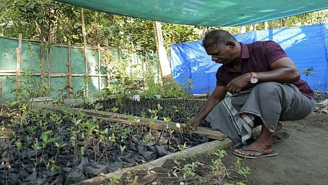 [caption id=“attachment_12470912” align=“alignnone” width=“640”] TP Murukesan inspects mangrove saplings that he grew at his home nursery on Vypin Island in Kochi, Kerala. AP[/caption]
