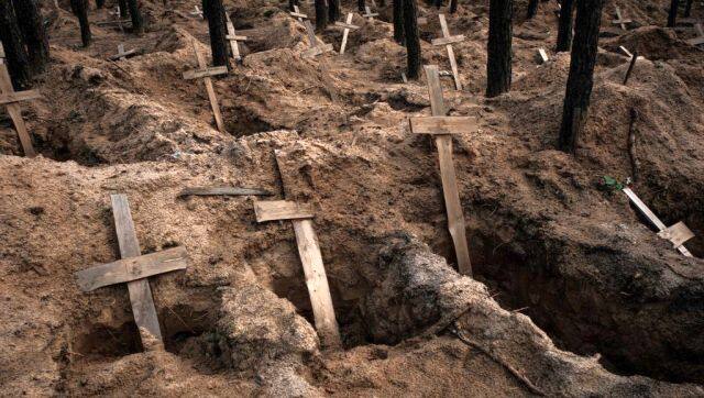 ” the country. As Moscow launched its offensive, reports and evidence of war crimes, crimes against humanity and genocide started emerging. The Russian forces left a trail of death and destruction. [caption id=“attachment_11852081” align=“alignnone” width=“640”] Empty graves after exhumation of bodies in the mass grave created during the Russian’s occupation in Izium, amid the Russian war in Ukraine. AFP[/caption] In April, the mayor of Mariupol said thousands of bodies were discovered in a mass grave discovered after Russian soldiers withdrew from that city. Later in Bucha, the bodies of 458 people were found. In September, seven months into the war, more than 440 bodies, including those of civilians and children, were found in