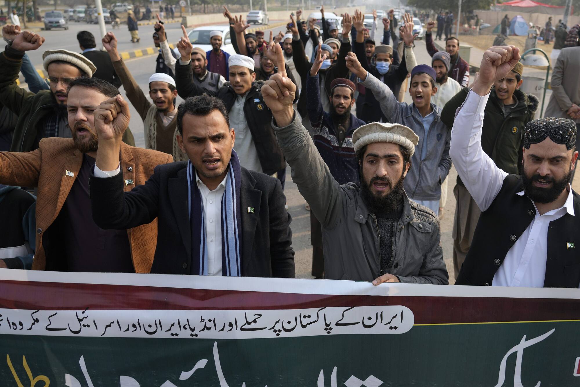 Members of Muslim Talba Mahaz Pakistan chant slogans at a demonstration to condemn Iran strike in the Pakistani border area,in Islamabad. AP[/caption] Pakistan