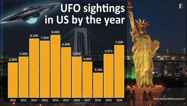 Graphic: Pranay Bhardwaj[/caption] The truth is out there For years and years, the idea that aliens had frequented our planet had been circulating among ufologists and the matter was treated as a fringe issue. However, in recent years, this has changed thanks in part to about the Pentagon’s secret efforts to make sense of unexplained encounters by military pilots and from members of Congress. The shift from considering UFOs as science fiction to fact has come about slowly but surely. In December 2017, the New York Times reported the existence of the Pentagon’s Advanced Aerospace Threat Identification Program. While the program wound up, Luis Elizondo revealed that he had continued its work informally with cooperation from the Navy and CIA until his resignation in the fall of 2017. Perhaps, what changed perceptions completely was the April 2021 incident. The US Navy confirmed the video of unidentified objects “buzzing” US warships near California. And from this was born the Office of the Director of National Intelligence (DNI)’s “preliminary assessment” of UFO sightings. The report revealed the Pentagon had recorded 144 observations of “unidentified aerial phenomenon,” or UAP, dating back to 2004, but could not determine the origins of all but one, including whether they were atmospheric or extraterrestrial. [caption id=“attachment_12923742” align=“alignnone” width=“640”]