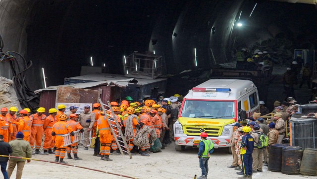 are brought to the tunnel site to be inserted through the rubble with the help of an auger machine for horizontal digging. However, the efforts suffer a setback when more rubble falls from the cavity created by the cave-in and causes minor injuries to two labourers. Meanwhile, a team of experts begins a survey of the tunnel and surrounding areas for soil testing. The trapped workers are supplied food, water, oxygen, electricity, and medicines as some of them complain of nausea and headache. 13 November – Day 2 Contact is established with the trapped workers through a pipe meant to supply oxygen to them and they are reported to be safe. Rescue efforts continue as Chief Minister Pushkar Singh Dhami visits the site. Not much progress is made in removing the debris accumulated on the collapsed part of the tunnel as fresh rubble keeps falling from above, further complicating the task of the rescuers. [caption id=“attachment_13385802” align=“alignnone” width=“640”]
