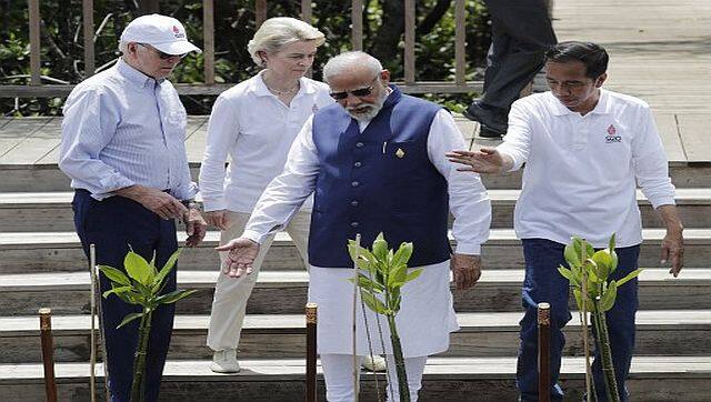 Indian Prime Minister Narendra Modi, US President Joe Biden and other leaders during a mangrove planting event as part of the G20 Leaders’ Summit in Nusa Dua, on the Indonesian resort island of Bali. AFP[/caption]