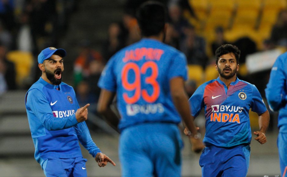 Shardul Thakur (R) bowled a brilliant final over in regular play where he defended seven runs in his final over. The Black Caps were only able to collect six runs which led to a tie. Image courtesy: Twitter @BCCI