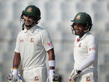 Captain Mushfiqur Rahim and Sabbir Rahman shared a century stand to help Bangladesh fight back from Nathan Lyon’s five-wicket haul and lead the hosts to 253 for six on the opening day of the second and final Test against Australia on Monday. Leading Australia’s three-pronged spin attack with the new ball in hand, Lyon claimed three wickets in the morning session and another soon after lunch to reduce Bangladesh to 85-4 at the Zahur Ahmed Chowdhury Stadium. [caption id=“attachment_4008031” align=“alignleft” width=“380”] Bangladesh’s captain Mushfiqur Rahim and Sabbir Rahman in action during the first day of the second Test against Australia. AP[/caption] Sabbir and Mushfiqur arrested the slide with a 105-run stand for the fifth wicket. Sabbir felt after tea but Mushfiqur was batting on 62 at stumps with Nasir Hossain on 19. Desperate to level the series after being humbled inside four days in Dhaka, Australia went in with three spinners and a lone paceman in Pat Cummins, a strategy they had not employed since 1978. Lyon was rewarded for his clever change of pace, and the Bangladesh batsmen paid the price for playing him on the back foot with the ball often keeping low. Mushfiqur won an important toss and unsurprisingly opted to bat against a spin-heavy Australian side but the hosts did not get the start they were looking for. Opener Tamim Iqbal looked uncomfortable against Cummins’ pace and was spilled in the slips by Glenn Maxwell. Lyon ensured it did not really matter, however, trapping the opener lbw for nine with a quicker delivery. Four overs later, Imrul Kayes fell in the same fashion after Australia successfully reviewed the original not-out decision. Soumya Sarkar added 49 runs with Mominul Haque but Bangladesh suffered another setback on the stroke of lunch. Lyon sent down a skidding delivery to dismiss Soumya for 33 and returned after the interval to claim Mominul for 31, the fourth successive lbw decision. Ashton Agar took the important wicket of Shakib Al Hasan, the architect of Bangladesh’s thrilling 20-run win in Dhaka, for 24 with under-fire Matthew Wade taking a fine catch behind the stumps. Sabbir was not afraid to play his shots and stepped out to hit Lyon for a six in his belligerent 66 before Wade effected a smart stumping to give Lyon his third five-wicket haul in successive Tests. Mushfiqur was his usual composed self at the other end as he brought up his 18th Test fifty.