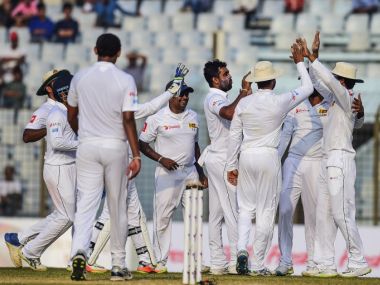 Chittagong: Sri Lanka spinners led by Rangana Herath took three crucial wickets late in day four to leave Bangladesh with an uphill task of saving the opening Test in Chittagong on Saturday. Bangladesh reached 81-3 at stumps, still needing 119 to make Sri Lanka bat again. The visitors declared their first innings at 713-9 in the final session. [caption id=“attachment_4334197” align=“alignleft” width=“380”] Rangana Nerath took three late wickets to leave Bangladesh reeling at the end of Day 4 of the 1st Test. Twitter/@OfficialSLC[/caption] Off-spinner Dilruwan Perera dismissed Imrul Kayes for 19 before left-arm unorthodox bowler Lakshan Sandakan got Tamim Iqbal caught behind for 41. Herath then removed Mushfiqur Rahim for two with his left-arm spin in the last over of the day. Mominul Haque — 18 not out — was at the crease when the players walked back after another run-filled day. Sri Lanka declared their innings in the third over into the final session with a lead of 200 runs in response to Bangladesh’s first innings total of 513. Left-arm spinner Taijul Islam, who returned figures of 4 -219, took two wickets off his successive overs to wrap up the Sri Lankan innnings. Taijul got the all-important wicket of skipper Dinesh Chandimal for 87 before off-spinner Mehedi Hasan removed Niroshan Dickwella for 62 to slow down the Sri Lankan progress. Debutant left-arm spinner Sunzamul Islam got his maiden Test wicket, trapping Dilruwan Perera leg-before for 32. Roshen Silva joined the run fest in the morning session to post his maiden Test century after Sri Lanka resumed on 504-3. He made 109 off 230 balls before becoming the first batsman dismissed on the day. Silva was Sri Lanka’s third century maker of the innings after Kusal Mendis and Dhananjaya de Silva, who made 196 and 173 runs respectively. Mehedi ended Silva’s impressive innings when the right- hander edged a low delivery to wicketkeeper Liton Das. Silva shared a 135-run stand with Chandimal for the fourth wicket and hit six fours and a six.