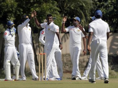 Day 1 Report: Sri Lanka batsmen made merry against a docile bowling attack by Board President’s XI, posting 411/6 declared at stumps on the first day of their two-day warm-up tie at the Jadavpur University campus ground on Saturday. Opener Sadeera Samarawickrama (74 off 77; 13x4) top-scored for the tourists, who tackled the third-string Board President’s XI bowlers with ease with as many as four batsmen scoring half centuries. [caption id=“attachment_4205519” align=“alignleft” width=“380”] Sri Lankan players celebrate the dismissal of Board President’s XI batsman Tanya Agarwal. AP[/caption] At the end of play, Niroshan Dickwella was batting on 73 with Roshen Silva for company on 36. Kerala medium-pacer Sandeep Warrier returned best figures of 2/60 with leg-spinner Akash Bhandari also bagging two wickets. What should augur well for the Dinesh Chandimal-led side is the fact that fit-again Angelo Mathews got back into the groove although he was not very fluent during his 93-ball 54. The former captain, who could not take part in the recent Pakistan series due to a calf injury, hit six fours and also got a reprieve on 53 when Jiwanjot Singh dropped him at first slip off Jalaj Saxena’s bowling just before tea. Mathews retired after the break. Before Mathews, openers Samarawickrama and Dimuth Karunaratne got off to a good start, engineering a 134-run stand for the first wicket. Samarawickrama looked good for his fluent 74 off just 77 balls, his innings studded with 13 fours before Avesh Khan removed the right-hander who tried to hook the Madhya Pradesh pacer to fine-leg where Tanmay Agarwal took the catch. Karunaratne hit seven boundaries before retiring on a 62-ball 50 while Lahiru Thirimanne (17) missed out on a big score, leggie Bhandari getting his wicket. Chandimal – in the thick of runs coming into the India series having amassed 224 runs in four innings against Pakistan at an average of 74.67 – took his time in the middle playing 65 balls for his 29 before retiring. The big-hitting wicketkeeper-batsman Niroshan Dickwella struck a quickfire 38-ball 53 before retiring while all-rounder Dilruwan Perera tonked a couple of sixes en route his 44-ball 48 before Warrier got his wicket. Dickwella was back towards the end of the day to continue his surge and end the day unbeaten on 73 off just 59 balls. Warrier’s second scalp was the promising Dhananjaya De Silva who could manage only 10 off 17 balls. Pacer Suranga Lakmal went for three with Bhandari getting him trapped in front. Saxena also got a wicket, that of Dasun Shanaka who contributed just two runs to the total. Brief scores: Sri Lanka 411/6 decl (Sadeera Samarawickrama 74, Niroshan Dickwella 73 not out, Angelo Mathews 54, Dimuth Karunaratne 50; Sandeep Warrier 2/60) With inputs from IANS