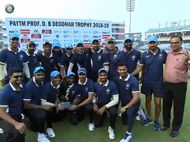 India C posing with the trophy after posting 29-run victory over India B. Image courtesy: Twitter/ajinkyarahane88[/caption] In reply, Shreyas Iyer hit eight sixes in his 148 off 114 balls, but India B finished on 323 in 46.1 overs. Iyer’s hundred was easily the best of the three tons but lack of support from the other end hurt the B team captain as he fought a lonely battle for the better part before getting dismissed by leg-spinner Rahul Chahar while trying to slog sweep. There was a heated moment as Rahul Chahar gave him a send-off and Iyer was seen angrily charging towards him. However, things were under control shortly. The most significant stand was the 116-run partnership for the second wicket with Ruturaj Gaikwad (60). India B were cruising along at one stage with Iyer and Ankush Bains (37 off 31 balls) adding 65 runs for the fifth wicket. Once Bains was sent back by left-arm spinner Pappu Roy (3/75), things started to get difficult. However, Iyer, continued to attack the C team bowlers during his 46-run seventh wicket stand with Deepak Chahar (21). Opting to bat, Rahane shrugged off his poor form and focussed on building his innings as he let Kishan take the opposition attack to the cleaners. Kishan’s innings had 11 fours and half a dozen sixes while the Indian Test vice-captain hit nine fours and three sixes. Save Jaydev Unadkat (3/52), who used variations to good effect on a batting track, the other B team bowlers leaked a lot of runs. Leg-spinner Mayank Markande (2/70 in 9 overs) and left-arm spinner Shahbaz Nadeem (0/62 in 10 overs) couldn’t stem the flow of runs in the middle overs. Kishan suffered due to poor umpiring as the ball was clearly missing the stumps. Rahane scored at less than run-a-ball but Suryakumar Yadav’s 18-ball-39 helped the C team notch up a winning score. Brief Scores: India C 352/7 (Ajinkya Rahane 144 no off 156 balls, Ishan Kishan 114 off 87 balls) India B 323 all out in 46.2 overs (Shreyas Iyer 148 off 114 balls, Ruturaj Gaikwad 60, Ankush Bains 37, Pappu Roy 3/75). India C won by 29 runs.