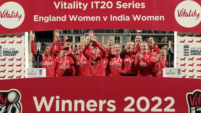 The England women’s team thumped India by 7 wickets in the third and final T20I to the clinch the series 2-1. Chasing a target of 123 runs at Bristol, the home side were off to a brilliant start as Sophia Dunkley and Danielle Wyatt put up a 70-run stand for the first wicket inside 10 overs. The partnership was eventually broken after Wyatt was sent back in the hut for 22 off 23 by Sneh Rana and her dismissal was followed by a couple of more wickets in quick succession, leaving the side slightly worried at 79/3 in 12.5 overs. Dunkley was cleaned up by Pooja Vastrakar for 49 off 44 while captain Amy Jones was undone by Radha Yadav for 3 off 5.