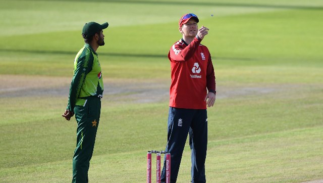 Toggle between the tabs above to switch between quick scorecard, full scorecard and ball-by-ball commentary 2nd T20I report: England captain Eoin Morgan smashed 66 runs off 33 balls to help his side to a five-wicket win over Pakistan in the second Twenty20 international on Sunday. Pakistan scored a challenging 195-4 after losing the toss at Old Trafford before England finished on 199-5 in 19.1 overs. England openers Jonny Bairstow (44) and Tom Banton (20) shared a 66-run partnership. When they departed in the space of two balls, Morgan came in to hit six fours and four sixes to keep the momentum going. [caption id=“attachment_8775701” align=“alignnone” width=“640”] Pakistan skipper Babar Azam (Left) and his England counterpart Eoin Morgan during the toss before the third T20I. AP[/caption] He was dismissed with 18 required in the last three overs but Dawid Malan, the junior partner in a match-changing 112-run stand with Morgan, went to another fifty to help England over the line with five balls to spare. Malan’s unbeaten 54 in 36 balls — his seventh 50-plus score in only 12 T20 innings — helped England move into a 1-0 series lead on a day when the BBC screened live coverage of a cricket match for the first time in 21 years. Morgan is averaging 48.4 with a strike-rate of 174.1 in the 14 T20s he has played for England since the start of last year, and the Irishman put his form down to the security he feels in his role. “Even before the series started, within T20 cricket in the last two years in internationals and some domestic are my best numbers to date which is great,” Morgan said. He added: “Before I became captain, jumping up and down the order I didn’t feel that comfortable with it, but now that it’s my decision I feel more at ease.” Pakistan’s innings, bolstered by 56 from 44 balls from captain Babar Azam and a more belligerent 69 from 36 deliveries by Mohammad Hafeez, was in vain and it now must win the third and final T20 on Tuesday to avoid a series defeat. The first T20 was abandoned as a no result because of rain in Manchester on Friday. England won a rain-affected Test series 1-0. With inputs from The Associated Press