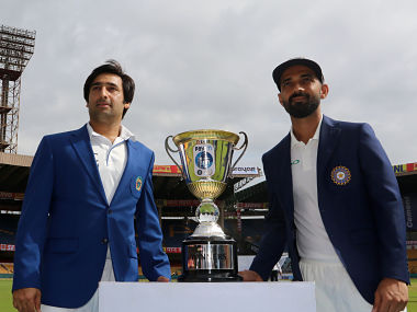 India vs Afghanistan, LIVE cricket score, Only Test, Day 2 at Bengaluru, Latest updates: India have dismissed Afghanistan twice in two sessions and beat them by an innings and 262 runs. It is as comprehensive as it gets. Jadeja missed his fifer but he won’t mind this has been an outstanding collective effort from the bowlers. Day 1 Report: Debutants Afghanistan clawed back with five wickets in the final session to spoil India’s run feast, built on rollicking centuries from openers Shikhar Dhawan and Murali Vijay as the hosts reached 347/6 at stumps on the opening day of the one-off Test on Thursday. All-rounders Hardik Pandya (10 not out) and Ravichandran Ashwin (7 not out) survived a few scares before heading back when the umpires dislodged the bails for the day, affected by two rain interruptions at the M Chinnaswamy Stadium. While India ruled the roost in most parts of the three sessions, Afghanistan had their moments in the second and final session with the wickets of Dhawan (107), and the quick dismissals of Vijay (105) and KL Rahul (54) off consecutive overs. Troubled by two rain breaks during which Vijay found himself stuck in the 90s, the Tamil Nadu opener kept his composure to notch up his 12th Test hundred in the final session. [caption id=“attachment_4510105” align=“alignleft” width=“380”] Indian captain Ajinkya Rahane (R) and Afghanistan skipper Asghar Stanikzai. Sportzpics[/caption] Vijay hit pacer Wafadar for a four over point to bring up his ton and together with Rahul, who by then had registered his half-century, forged a valuable 112-run stand for the second wicket. With his 12th Test ton, Vijay also became the batsman with most first innings centuries without one in the second innings. But soon after reaching his century off 143 deliveries, Vijay found himself trapped leg before by Wafadar even as the review did not help his cause. The visitors struck in the very next over when pacer Yamin Ahmadzai induced a faint inside edge off Rahul which uprooted his off-stick, and as a result brought Pujara and Rahane together. Rahane survived a caught behind decision early in his innings before being saved by a review but failed to make the most of the opportunity as Rashid Khan caught him plumb in front after two frustrating sessions. Rashid could have immediately got his second Test wicket in the form of the dangerous Pujara, who on 30 was dropped at first slip by Mohammed Nabi. But Nabi soon rectified the mistake with a superb catch at leg slip to pack back the Saurashtra batsman off the 17-year-old spinner Mujeeb. India immediately lost another wicket when stumper Dinesh Karthik (4) departed off an unnecessary run-out with the scoreboard at 334/6. Thereafter, Ashwin and Pandya joined forces and the duo played out the rest of the day cautiously. Earlier, opting to bat after winning the toss, India got off to a breezy start with Dhawan smashing a quickfire century to pile up 158/0 at lunch in the lop-sided opening session. Dhawan looked in sublime touch right from the start, punishing the pace duo of Ahmadzai and Wafadar for glorious boundaries before taking his Sunrisers Hyderabad teammate Rashid to the cleaners. Dhawan looked unstoppable and got to his seventh Test ton in a mere 87 balls even as the Afghan spin trio of Nabi, Rashid and Mujeeb seemed all at sea with this format. For the Afghans, Ahmadzai was the pick of the bowlers with a couple of wickets while Wafadar, Rashid and Mujeeb contributed with one wicket apiece. With inputs from IANS